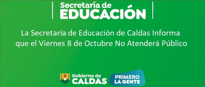 Se avisa a la comunidad educativa de Caldas y público en general que el día viernes 8 de octubre no se atenderá público en la instalaciones de la Secretaría de Educación de Caldas, debido a que todos los funcionarios deben asistir a la Socialización de los Indicadores de Gestión  y la Revisión de Indicadores de Gestión de la Secretaría de Educación, dicha actividad se realizará fuera de las instalaciones de la Secretaría.