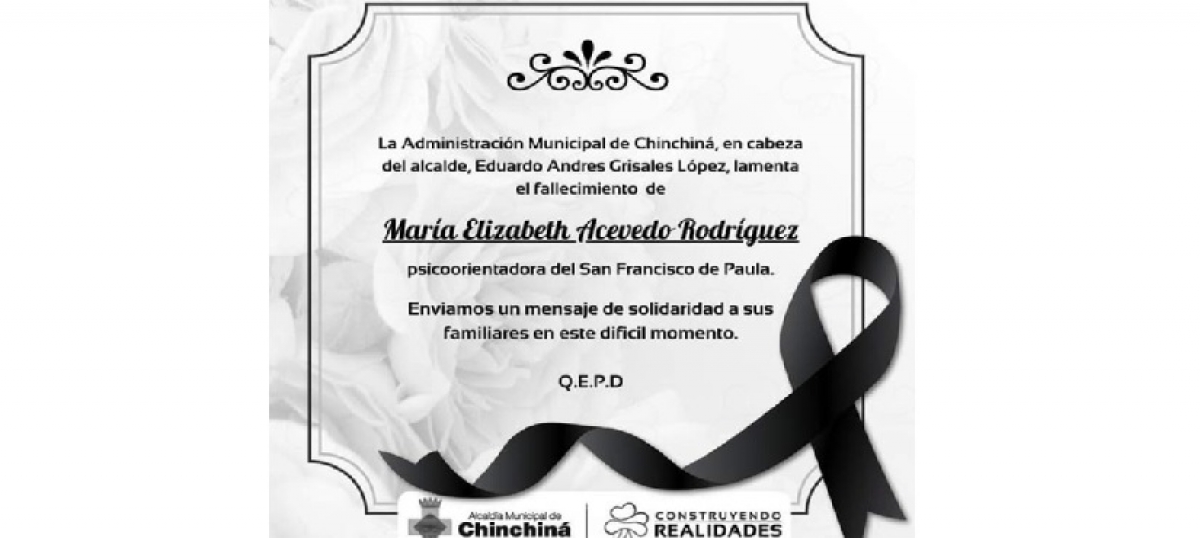 La Secretaría de Educación de Caldas expresa sus condolencias por el fallecimiento de MARÍA ELIZABETH ACEVEDO RODRÍGUEZ,   Psicoorientadora de la Institución Educativa San Francisco de Paula de Chinchiná, cuyo recuerdo vivirá por siempre en los corazones de sus amigos, compañeros,  directivos docentes, docentes, estudiantes, familiares y amigos.